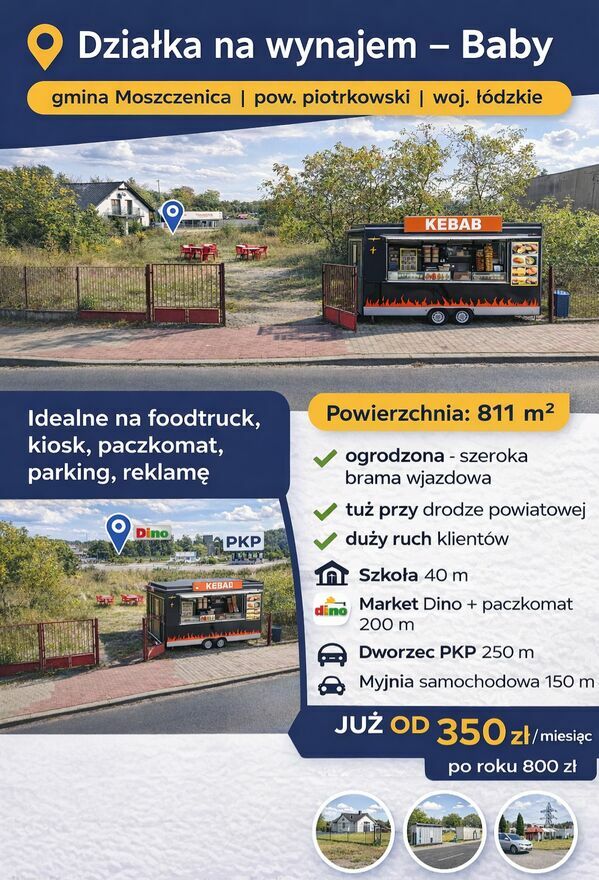 Działka znajduje się w strefie gęstej zabudowy jednorodzinnej, bezpośrednio przy drodze powiatowej o stałym natężeniu ruchu (główny ciąg komunikacyjny dla mieszkańców i osób dojeżdżających do pracy). Ogromnym atutem jest zlokalizowany zaledwie 200 metrów dalej market Dino, przy którym funkcjonuje paczkomat InPost. Ponadto w bezpośrednim sąsiedztwie działki znajdują się: Szkoła podstawowa (ok. 40 m – DUŻY PARKING), Dworzec PKP Baby (ok. 250 m) oraz Myjnia samochodowa (ok. 150 m).